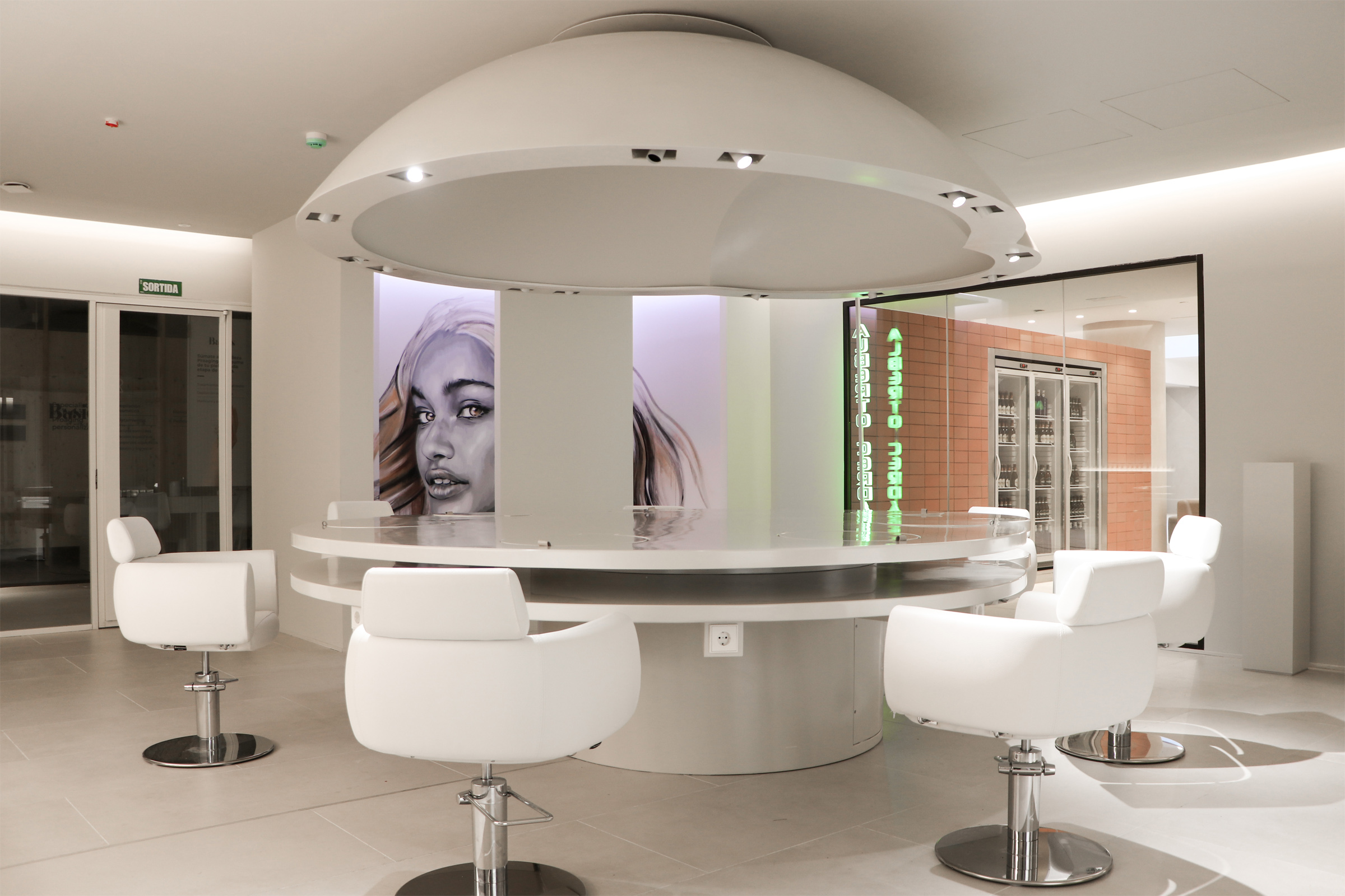 Alberto Cerdán opened a space in one of the uptrend beauty areas in the city, featuring a sizeable 3-meter table and resin-made lamp of the same size in the center of the saloon. The idea allowed groups of friends to enjoy a beauty routine while facing each other, making interacting easier.